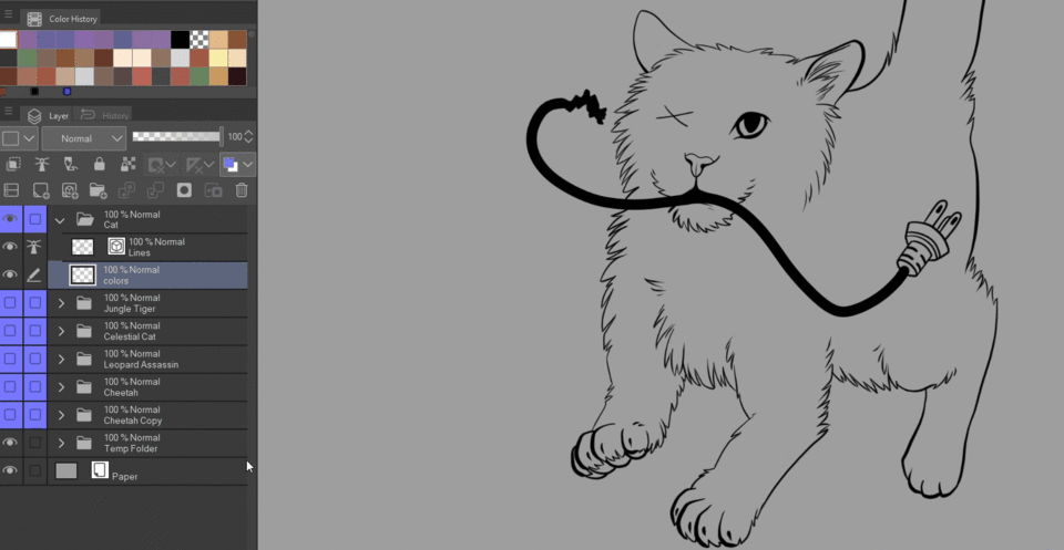 따라서 해당 옵션을 켜면, 단순히 선 레이어를 참조 레이어로 설정하고 색상 레이어에 그리면 됩니다! 레이어 간이든 도구 간이든 왔다 갔다 할 필요가 없습니다.