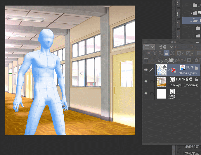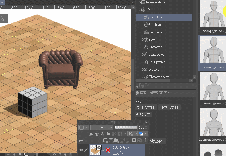 3D 프리미티브는 3D 오브젝트 및 3D 스케치 인형과 같은 레이어에 놓을 수 있습니다.그림을 그릴 때 오브젝트 배치나 차지하는 부피를 참고하는 보조 도구로 사용할 수 있습니다.
