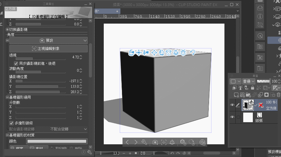 ↑ 각 모서리의 작은 사각형은 3D 프리미티브의 길이, 너비, 높이를 변경할 수 있습니다.(CLIP Ver.1.12.7 업데이트 후 3D 오브젝트도 동일하게 변경 가능)P.S. 이 부분의 예시 그림에서 바닥은 CLIP 소재 상점에서 구매한 소재를 사용했습니다.