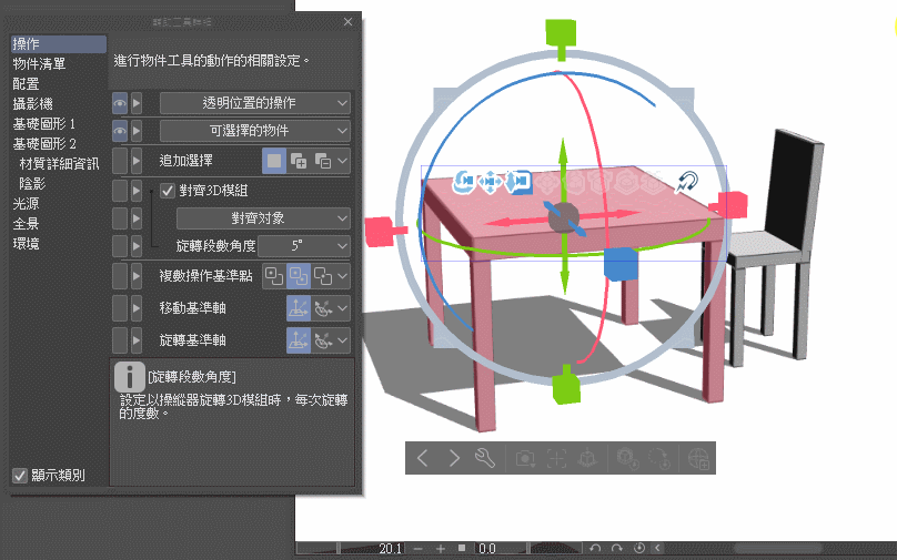 도구 속성 팔레트(Tool Property) 오른쪽 하단의 렌치 아이콘을 클릭하여 보조 도구 상세(Sub Tool Detail) 팔레트를 엽니다.작업 카테고리에서 여러 개체용 피벗 점(Pivot point for multiple objects)을 찾을 수 있습니다.기본값인 "중앙에 각각의 원점"을 다른 옵션으로 변경합니다."처음 선택한 개체" 또는 "여러 개체의 중간 지점"을 선택하면 테이블을 구성하는 블록을 전체적으로 함께 확대/축소할 수 있습니다.