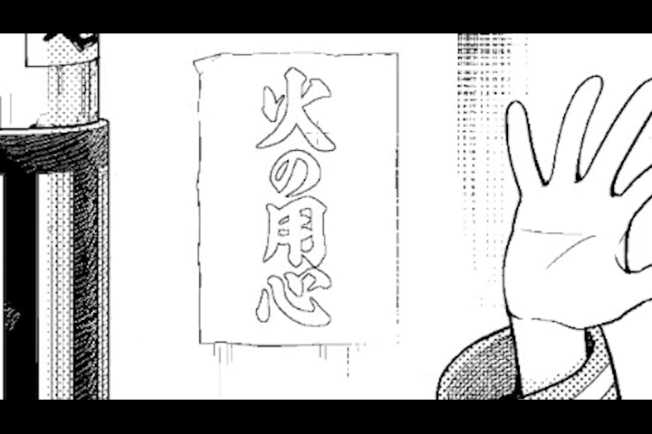 먼저 글자 아래에 해칭을 그려서 하프톤의 바탕을 만듭니다.다음으로, 글자를 [편집] 메뉴의 [필터]-[계조 반전]으로 흰 글자로 바꿉니다.마지막으로 약간 부분적으로 가필하여 글자가 쓰여 있는 듯한 느낌을 줍니다.