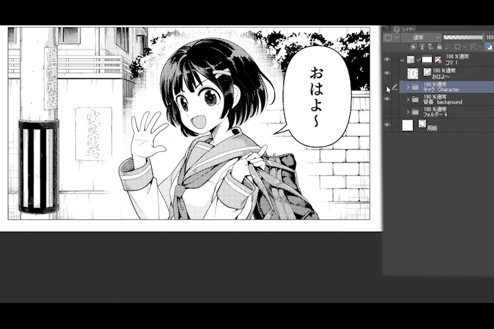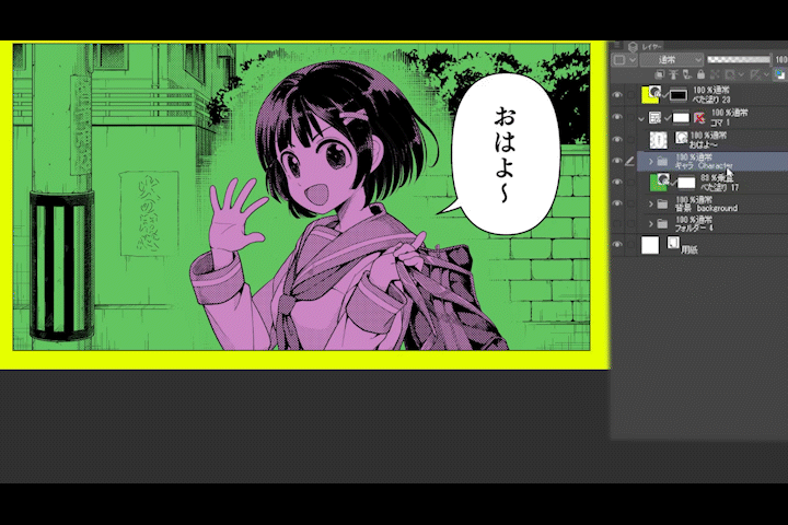 흰색 바탕을 적용한 캐릭터 폴더를 패널 레이어 위에 배치함으로써 캐릭터가 튀어나오는 듯한 효과를 얻을 수 있습니다.이 기술을 "부치누키(Buchi-nuki)"라고 합니다. "칸막이를 관통하다"라는 의미의 일본어에서 유래했습니다.