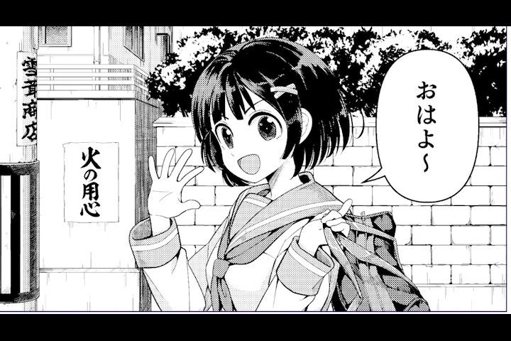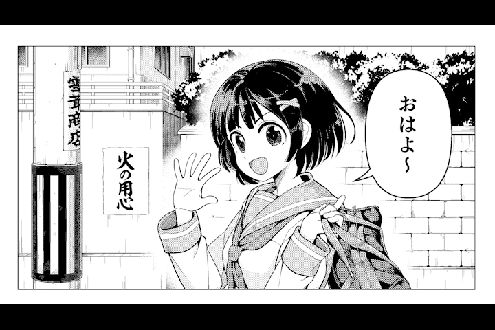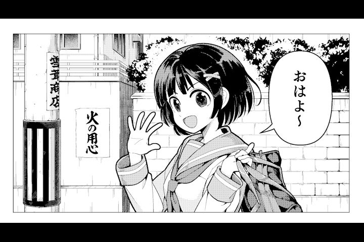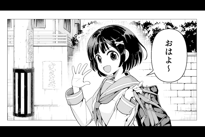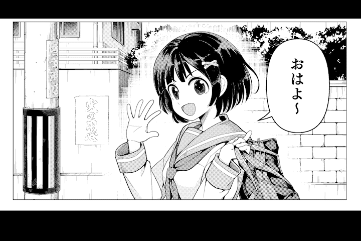 그럼 바로 이 패널을 봐주세요.아침 등굾길에서 여학생이 [안녕]이라고 인사하는 상황입니다.