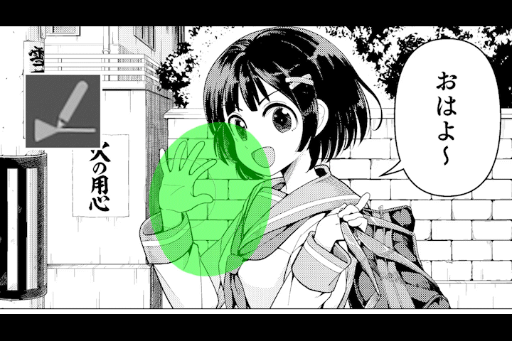유선 브러시(Speed line brush)는 한 번에 많은 선을 그릴 수 있는 브러시로, 평행선 자에 스냅할 수 있어 해칭을 그리는 데 최적입니다.이 유선 브러시를 사용하여 캐릭터와 배경 사이에 흰색 해칭을 그립니다.거즈로 그리는 것보다 자연스러운 인상의 묘사를 할 수 있습니다.