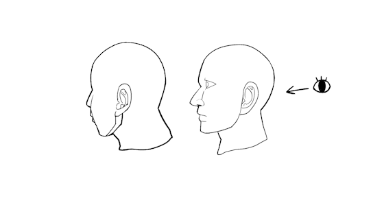 귀는 수직이 아니라 약간 기울어져 머리에 붙어 있지만, 이 각도를 상상하기는 어렵습니다. 하지만 이 각도를 감각적으로 파악하는 방법이 있습니다.