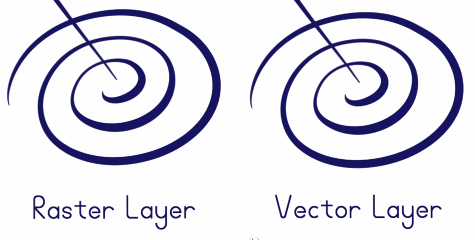 반면에 벡터 레이어는 그러한 정보를 전혀 저장하지 않습니다. 대신, 그 위에 선을 그릴 때, 레이어에 위치 지점을 저장하고, 특정 곡률, 색상, 선 두께, 불투명도 및 모양으로 그 지점들 사이에 선을 그립니다.