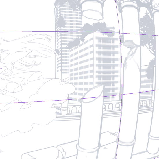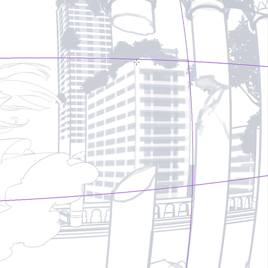 이 그림에서는 뒤의 빌딩숲을 브러시로 그려넣었습니다. 그리드에 스냅시켜 정확한 왜곡을 표현했습니다.