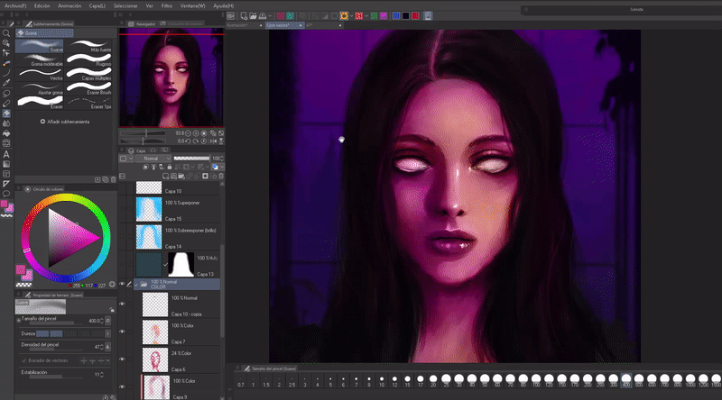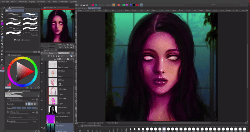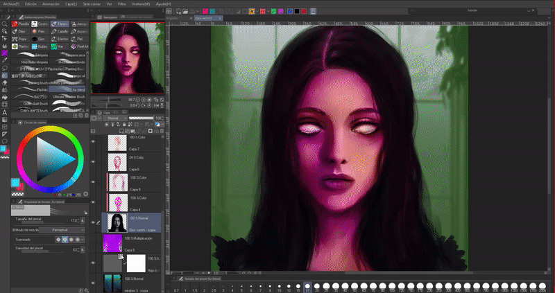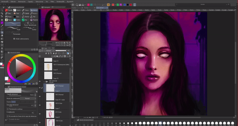 더 빠르게 하려면 CLIP STUDIO ASSETS에 이 전용 브러시가 있습니다. 이를 사용하려면 분위기에 따라 어두운 색상의 '곱하기' 모드 레이어를 만들고, 그 레이어에 비싼 색상이나 직접 선택한 흰색 브러시를 사용합니다. 그런 다음, 빛과 그림자 사이에 채도 높은 효과를 추가할 수 있습니다.