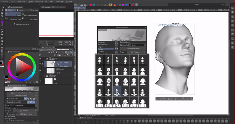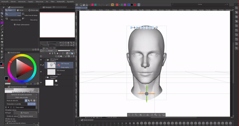먼저 얼굴이 어떤 각도에 있는지 설정해야 빛과 그림자를 어디에 배치할지 더 잘 파악할 수 있습니다. 모델을 클릭하면 메뉴가 나타나며, 여기에서 얼굴의 회전, 크기, 캔버스에서의 위도를 조절할 수 있습니다.