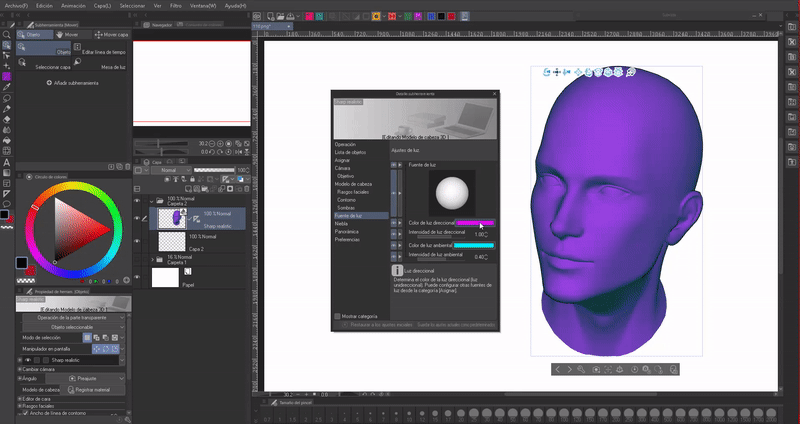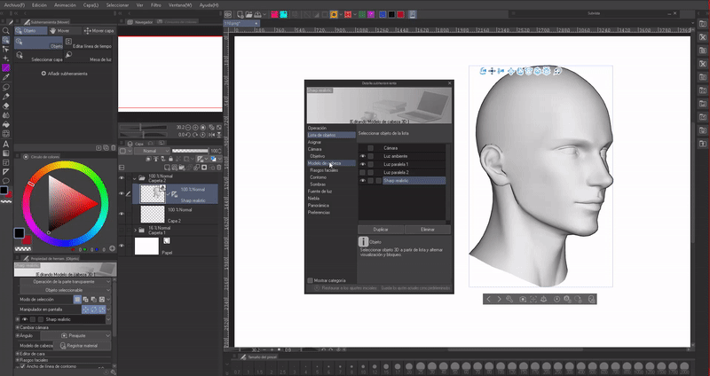 처음에는 빛의 각도에 따라 빛과 그림자를 어디에 배치해야 할지 시각화하기 어려울 때 시각적 참고 자료가 유용합니다. 이러한 어려움을 해결하기 위해 CLIP STUDIO PAINT에는 새로운 기능인 “3D 머리 모델”이 있습니다.