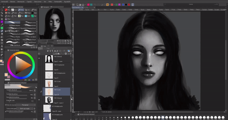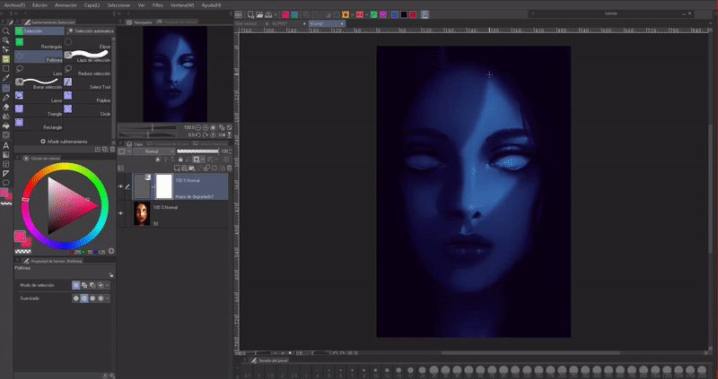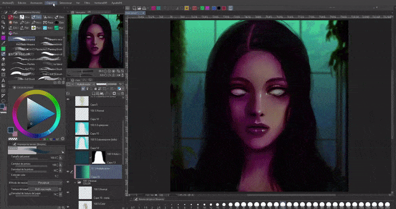 극적인 하이라이트의 경우 동일한 절차를 따릅니다. 예를 들어, 빛이 뒤에서 온다면 얼굴은 어두워질 것입니다. 이전에 설명한 대로, 불투명도를 낮춰 그림자의 깊이를 조절할 수 있는 곱하기 모드 레이어를 사용하여 어둡게 하고, 빛을 위해서는 발광 닷지 모드 레이어를 사용하여 몸의 실루엣을 칠하고 분위기에 맞는 밝은 색상, 이 경우 파란색을 사용하여 배경을 밝게 합니다. 그 후, 오버레이 모드의 다른 레이어에서 머리카락 위의 부분을 밝게 합니다.