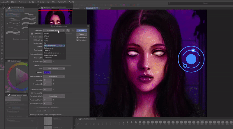 이제 음영 처리 유형을 “셀 셰이딩”으로 변경하겠습니다. 이 모드는 반실사 일러스트레이션에서 가장 좋은 결과를 제공합니다. 선택한 시간대에 따라 하나 또는 여러 수준이 나타나며, 색상을 변경할 수 있습니다. 마지막으로, 일러스트레이션에서 움직일 수 있는 파란색 원을 확대하거나 축소하여 빛과 그림자 효과의 강도를 조절합니다. 마지막으로, 빛의 유형을 '임의' 또는 '구형'으로 변경할 수 있습니다.