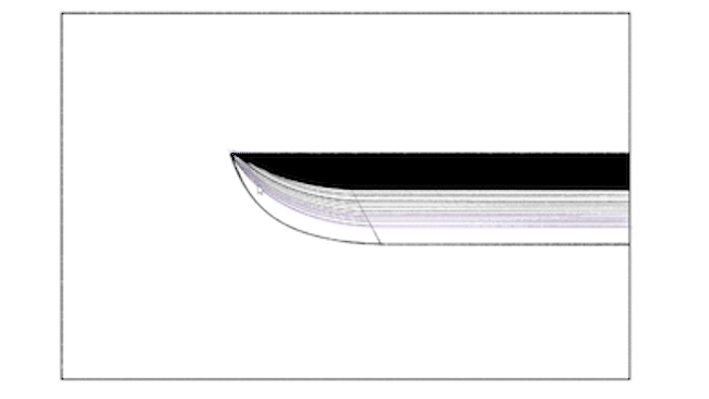 다중 곡선 자는 평행 곡선 자와 비슷하지만, 오브젝트 툴로 이 막대가 달린 둥근 마크를 돌리면 자의 끝이 가늘어져 약간 원근감이 있는 휘어진 스피드 선을 그릴 수 있습니다.