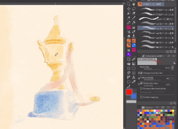 CLIP STUDIO ASSETS 라이브러리에서 무료로 사용할 수 있는 몇 가지 수채화 효과 브러시는 다음과 같습니다: