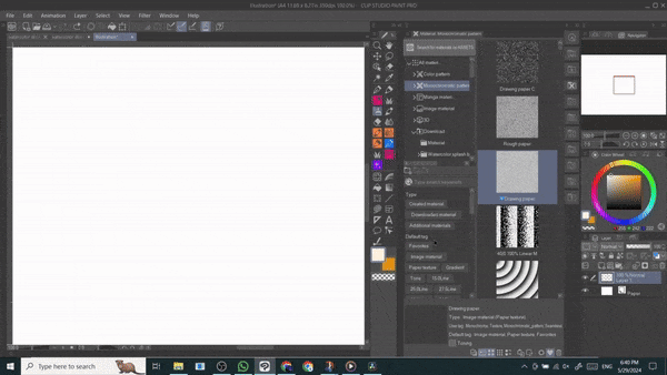 먼저 캔버스에 종이 질감을 적용합니다. 저는 기본 드로잉 종이 질감을 사용하고 있습니다. 블렌딩 모드를 [오버레이]로 설정합니다. 이 레이어는 항상 맨 위에 유지됩니다.