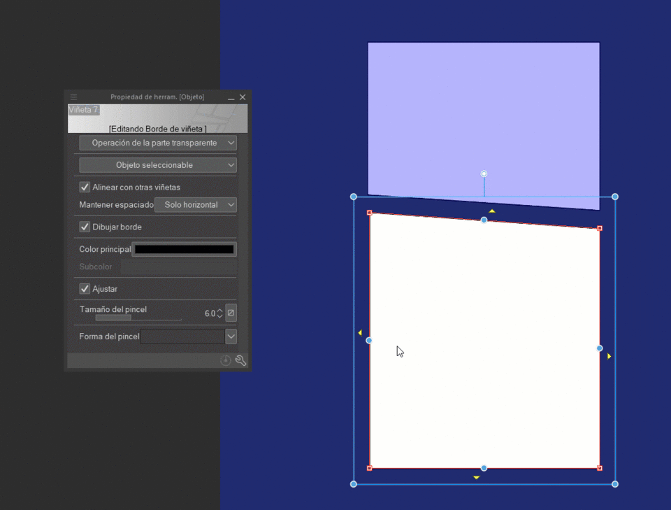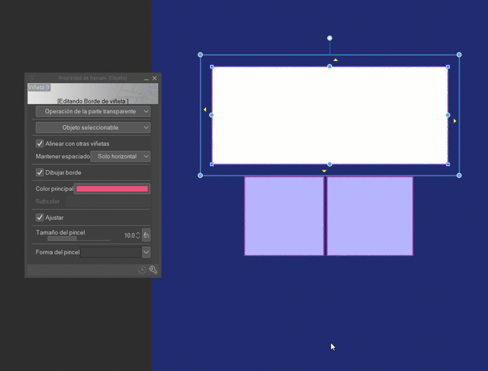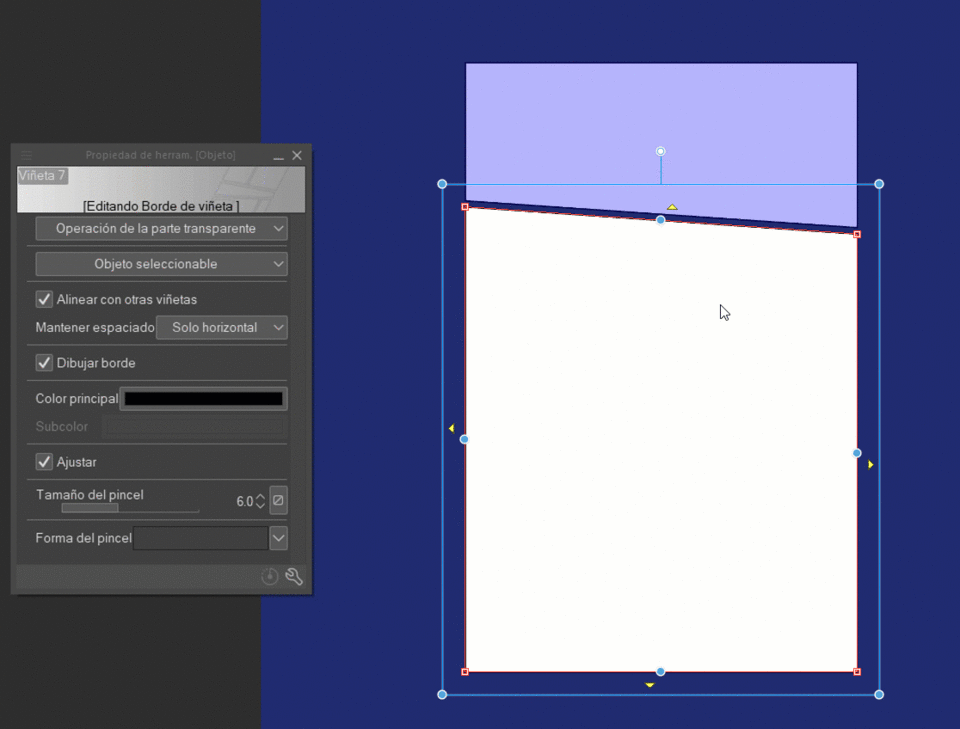 모서리의 빨간색 사각형은 말풍선 테두리의 제어점을 변경할 수 있게 합니다. 다시 말해, “수평으로만” 또는 “모두 유지”로 간격 유지가 설정되어 있다면 주변 말풍선에 대한 변경 사항이 조정됩니다.