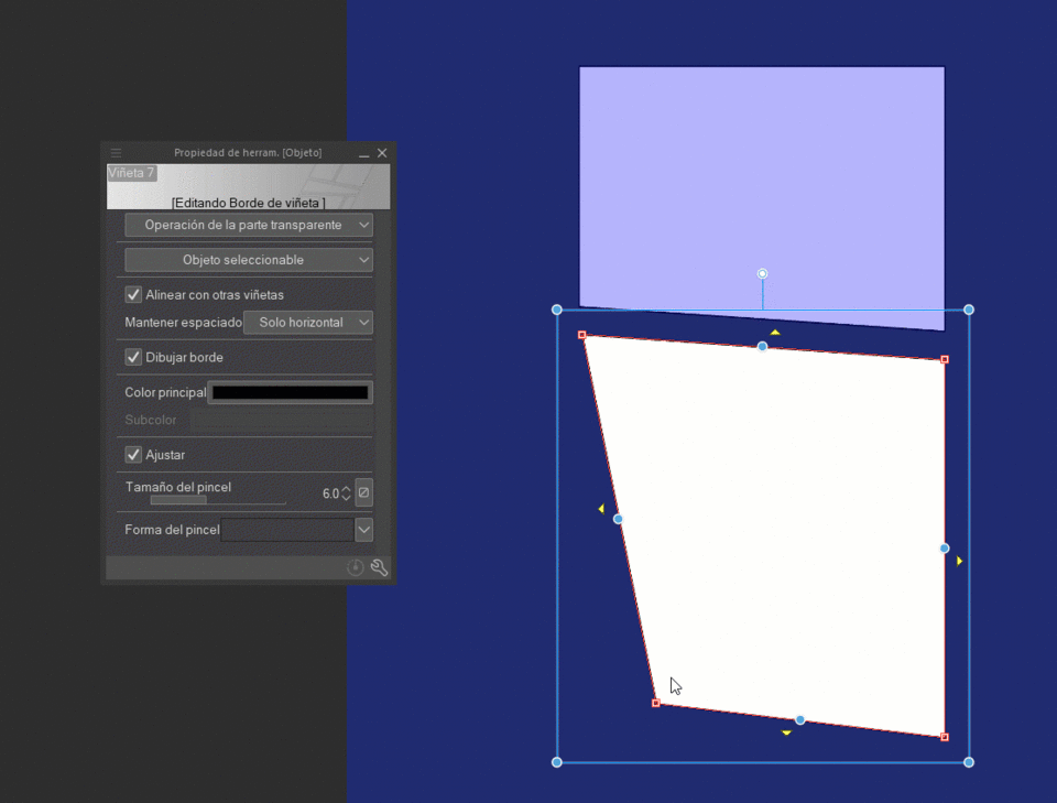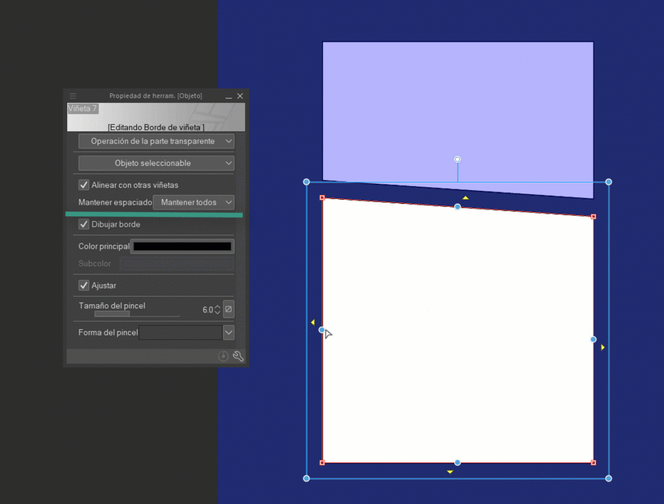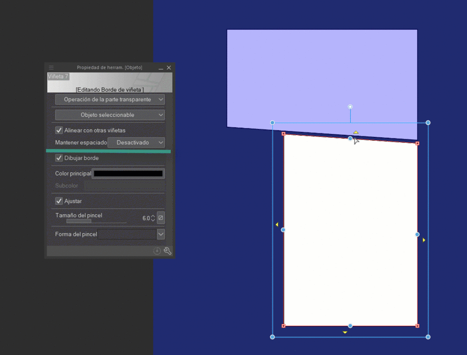 말풍선 테두리의 노란색 삼각형은 테두리를 주변 말풍선과 겹치도록 이동할 수 있게 합니다. 다른 말풍선이 없다면 말풍선은 캔버스 가장자리에 붙습니다.