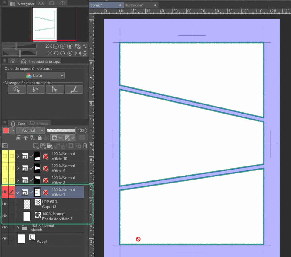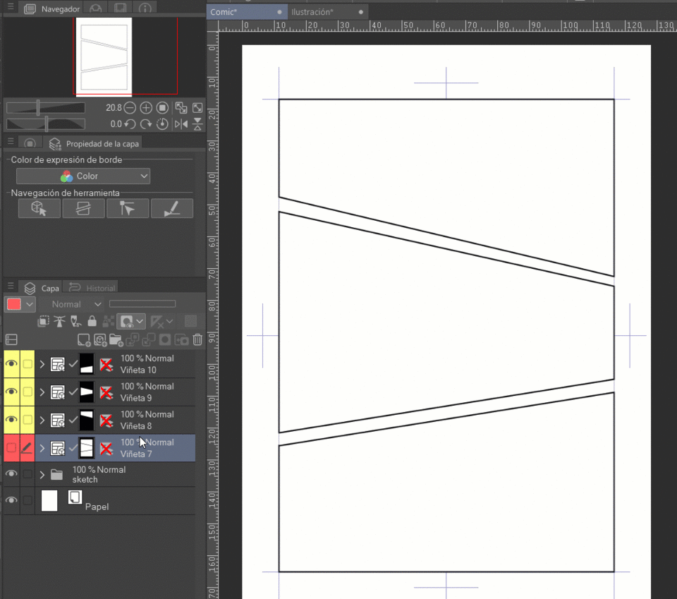 작은 패널은 더 빠르게 읽히는 경향이 있으며, 시선이 머무는 시간이 짧습니다. 이는 빠른 액션과 삽입 패널에 가장 적합합니다. 이러한 작은 패널들이 여러 개 함께 있으면 짧은 연속적인 작은 액션의 인상을 줄 수 있습니다.
