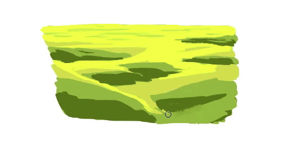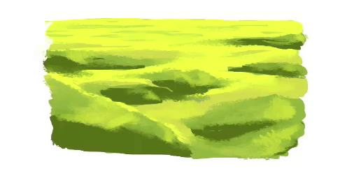 햇볕이 잘 드는 날을 그리고 있기 때문에, 밝은 노란빛이 도는 녹색을 사용하여 직사광선을 받는 땅을 강조할 것입니다. 배경은 멀리서 보면 융기와 틈새가 더 평평해 보여 햇빛이 지배적으로 유지되므로 가장 밝게 보일 것입니다.