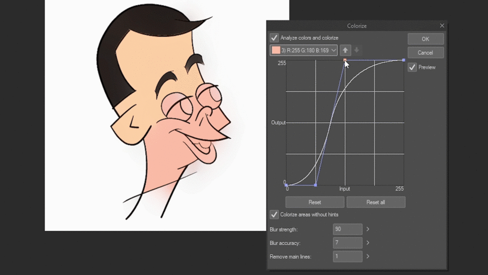 เมื่อเลือกฟังก์ชัน “Analyze colors and colorize” คุณสามารถใช้ Tone Curve ที่เรียกว่า Tone Curve ซึ่งช่วยให้คุณสามารถปรับการแสดงผลของสีได้