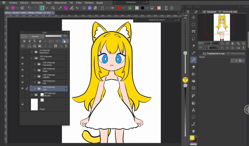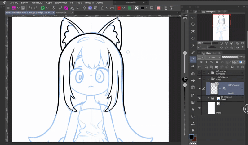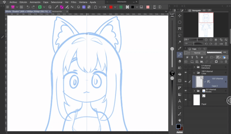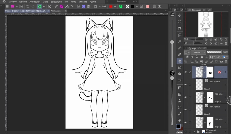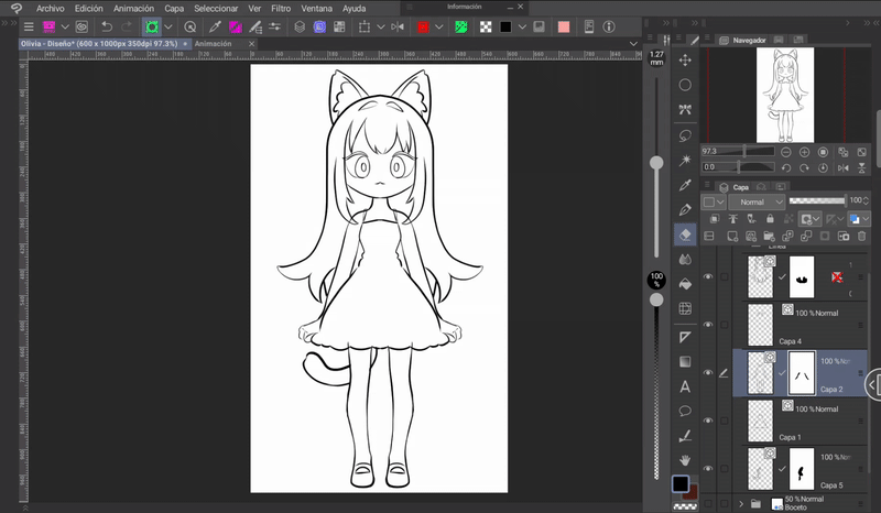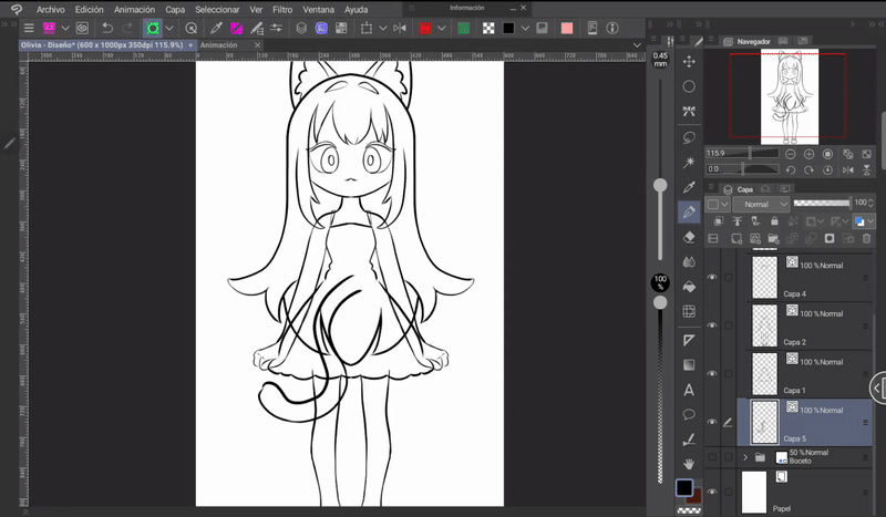 首先是要有一個要製作動畫的角色。我為大家介紹這位可愛的貓女孩,我將她命名為 Olivia(朋友間稱 Oli)。設計好角色後,我們就開始清理草稿。