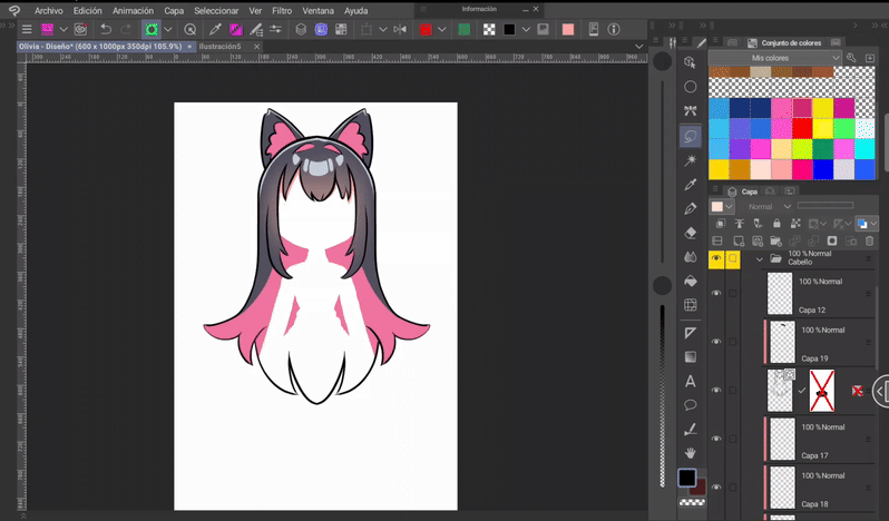 現在我們已經有了圖層分離,接下來是顏色。為了添加顏色,我將從頭髮開始,為此我將啟用被圖層遮罩隱藏的區域。