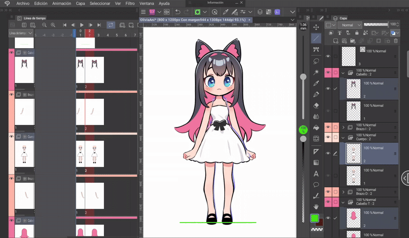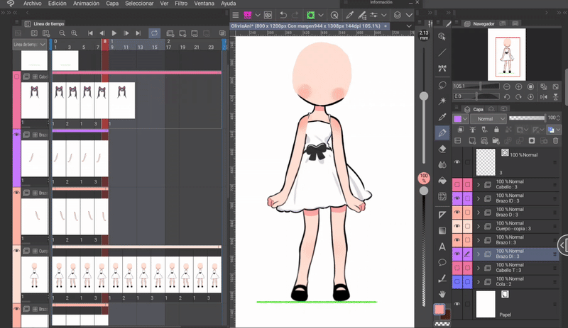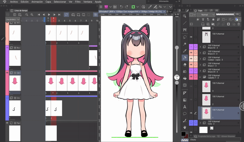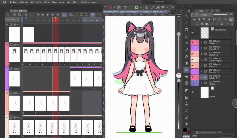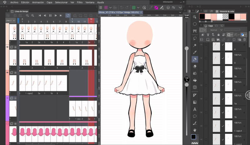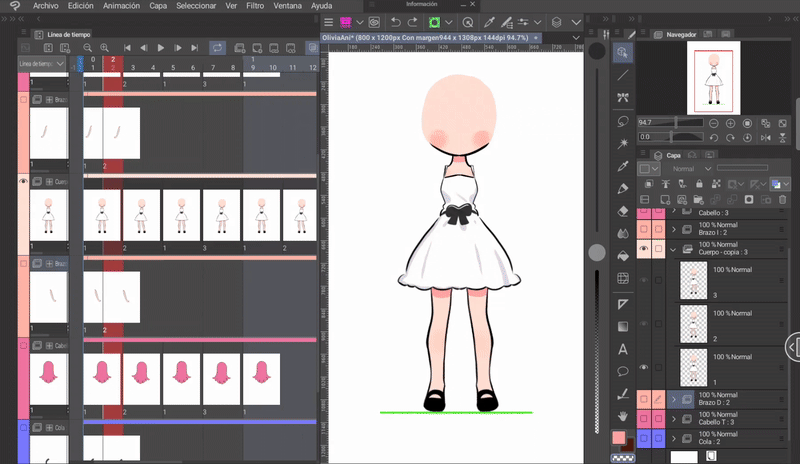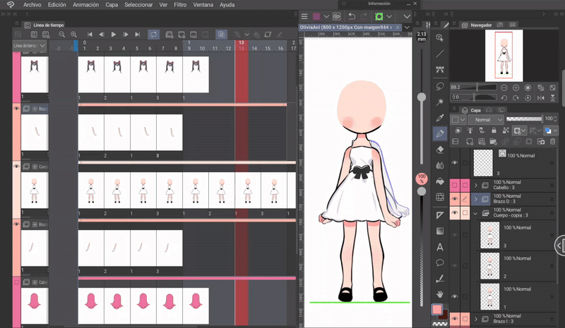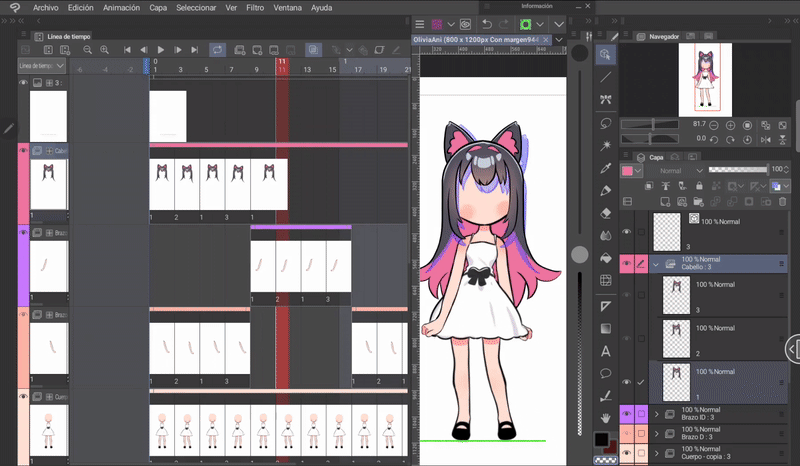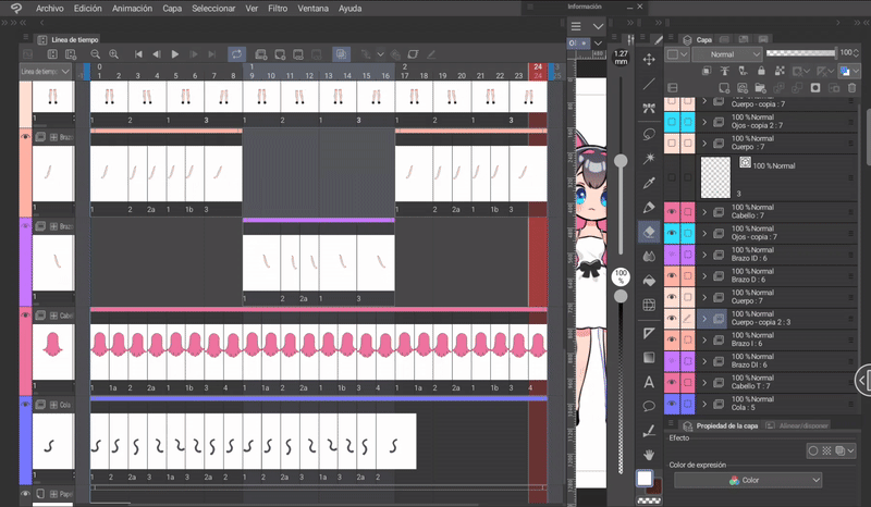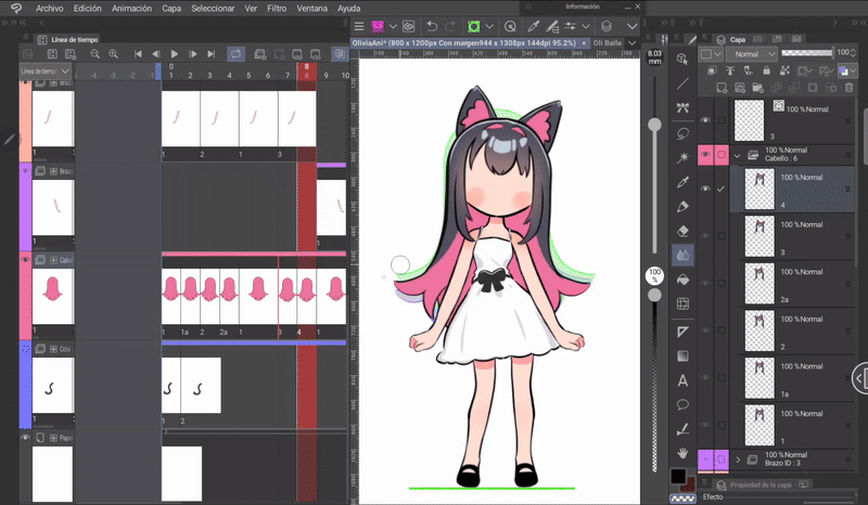 如果我們像身體動畫一開始解釋的那樣,同時編輯身體和頭髮的姿勢,那麼我們就已經有了三層頭髮,它們位於與身體相對應的位置。現在只需根據序列在對應的單元格中調用圖層來完成時間軸。