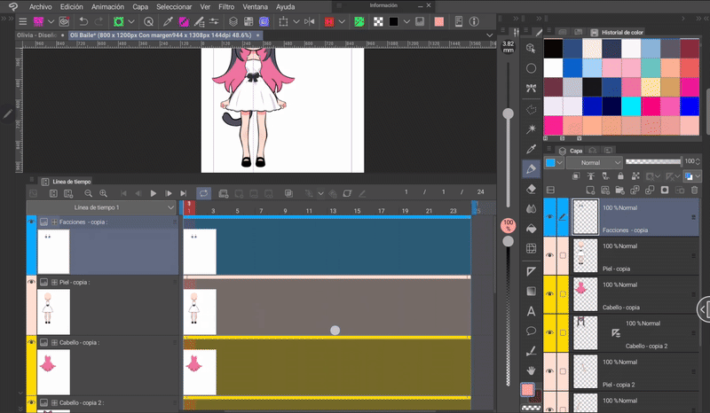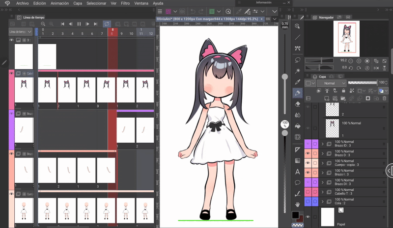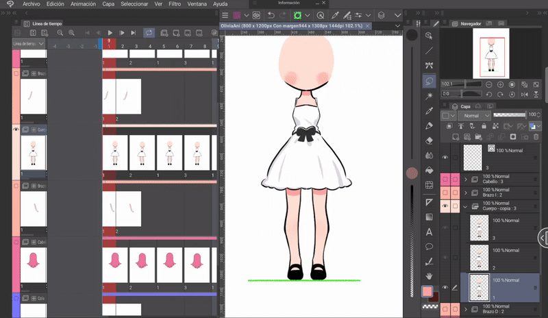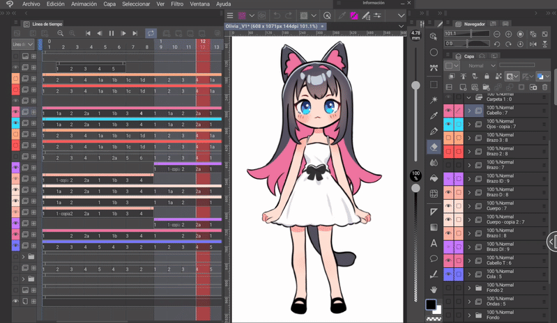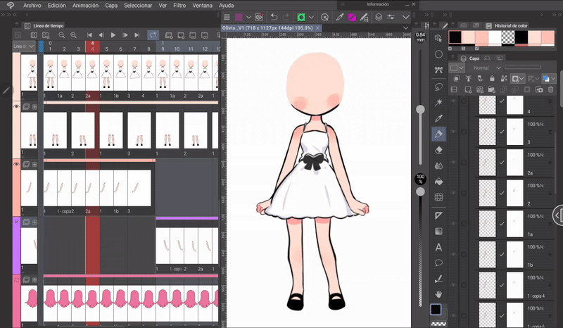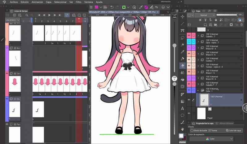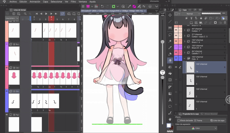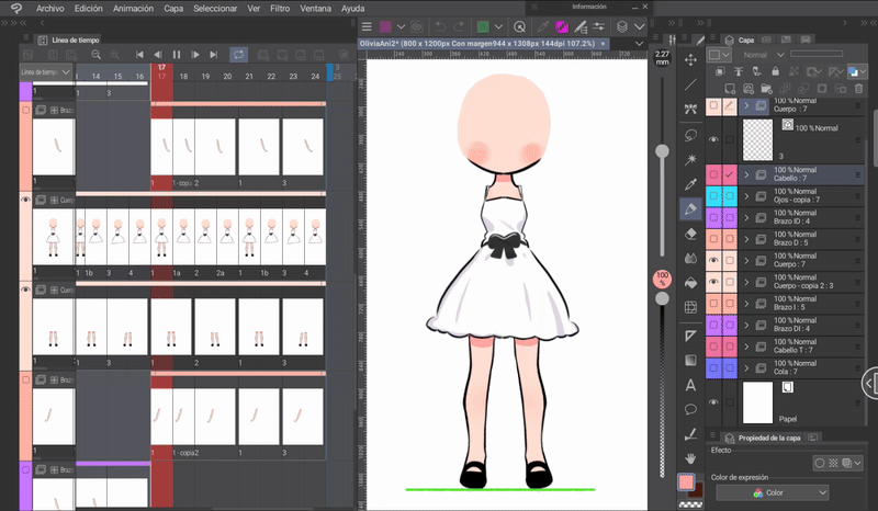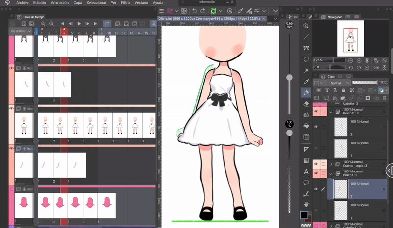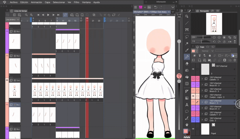 如果我們像身體動畫一開始解釋的那樣,同時編輯身體和頭髮的姿勢,那麼我們就已經有了三層頭髮,它們位於與身體相對應的位置。現在只需根據序列在對應的單元格中調用圖層來完成時間軸。