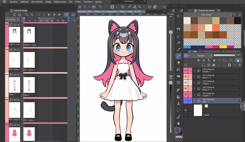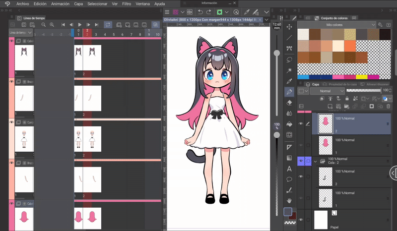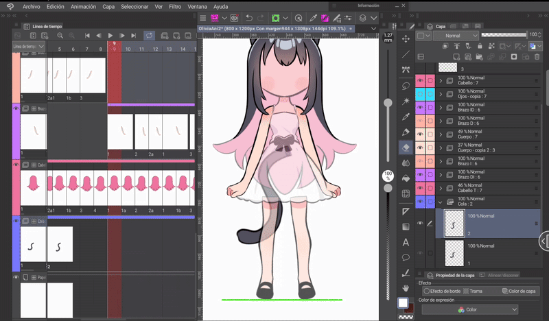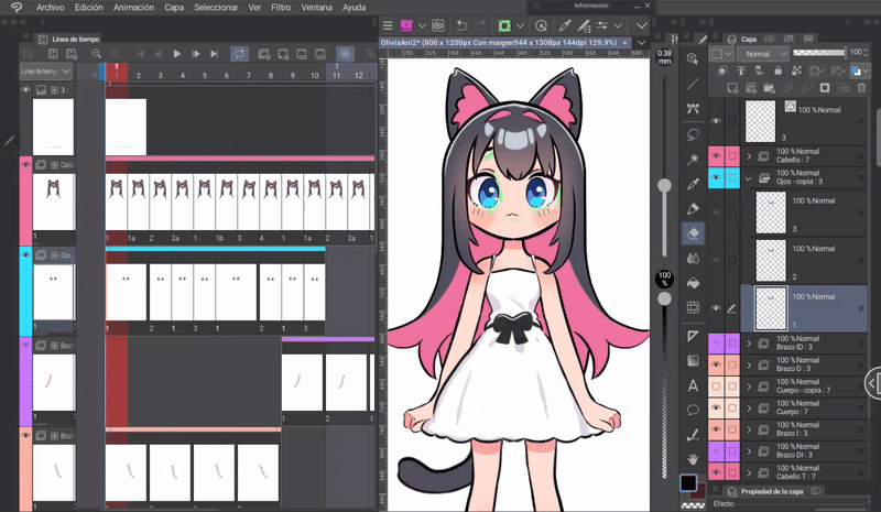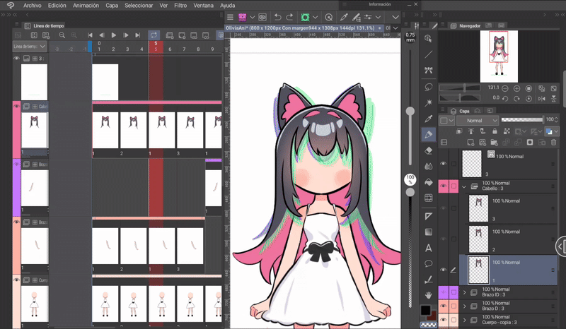 如果我們按照前面的步驟,應該已經完成了影格。現在只需編輯前髮的四個新圖層,但僅限於耳朵。我們將進行的編輯將是前一個和後一個影格位置之間的中間動作。