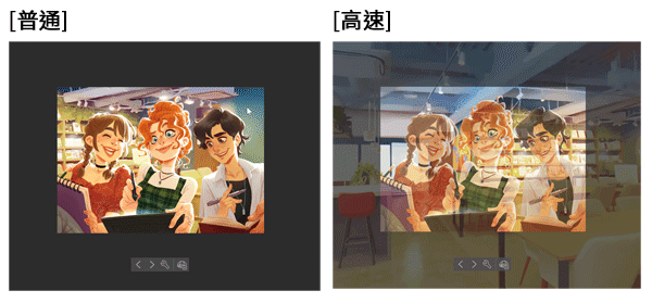 操作全景時,如果變更[工具屬性]面板下方的[設定編輯顯示],可以改變畫面的顯示。若設為[高速],全景會和上方的圖層、畫布外側重疊顯示。若設為[普通],就不會顯示於插圖和畫布外側。