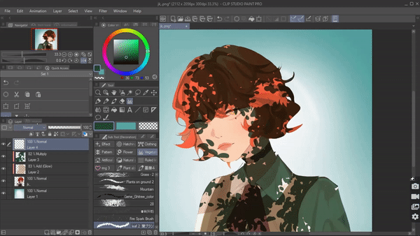 然後在上面創建另一個圖層並將其模式設置為乘法。現在選擇一個有樹枝和樹葉的自定義畫筆,我正在使用這個。選擇一種深綠色,然後將其塗在角色上