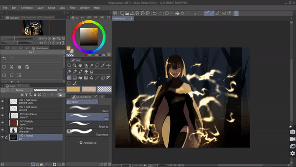 現在在上面創建一個新層並剪裁它。設置它的混合模式來添加光暈拿一把噴槍,選擇一種更亮的顏色,比如黃色,然後把它塗在角色的邊緣。我們完成了。