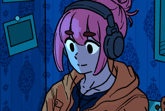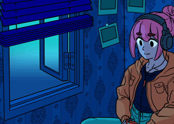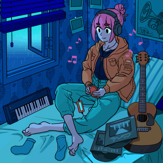 範例作品描繪的是在黑暗的房間中,放鬆地聽著音樂的女孩。