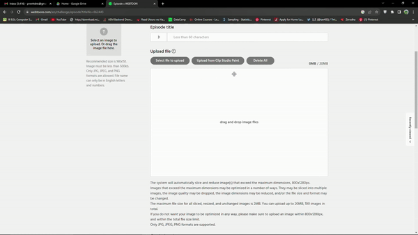 讓我們以我希望在第一次創建 webtoon 時就知道的導出設定來結束本教程。如果我們查看網路漫畫上傳頁面,我們只能上傳 800x1280px 的頁面。或更少。但是如果你看我的webtoon頁面,畫布長度超出了webtoon設定的限制。之前我只是將我的網路漫畫儲存為 png 並使用網站剪切頁面。直到我意識到剪輯工作室可以在匯出時執行相同的操作。