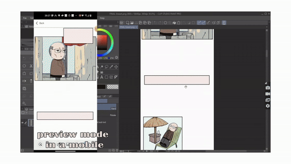 當我第一次開始創作漫畫時,我總是擔心面板的節奏和移動視圖中文字氣泡的可讀性,因為大多數觀眾更喜歡在手機上閱讀網路漫畫。但我們在更大的螢幕上創建漫畫,因此在桌面螢幕上看起來可讀的文字氣泡在智慧型手機螢幕上看起來並不相同。因此,在發布之前有必要檢查您的網路漫畫在行動裝置上的顯示效果。但如果我必須以手機格式預覽我的網路漫畫,我必須先儲存檔案並將其發送到我的手機。如果我發現任何錯誤,例如兩個面板太靠近,我就必須糾正它,然後再次將其發送到我的手機上,這真是太累了。