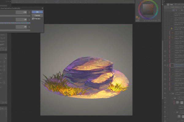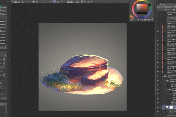 我最喜歡的筆刷是扁平筆尖,帶有各種顏色混合設定和岩石紋理。它們非常適合概念快速繪製和最終渲染。