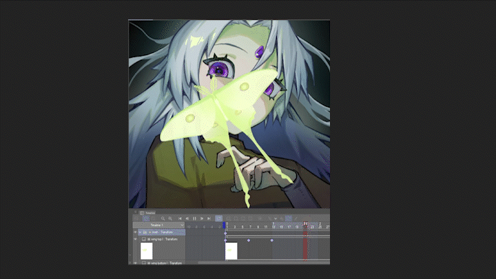 我也將大部分虹膜動畫放在飛蛾不拍動翅膀的部分,這樣就給人一種眼睛正在對飛蛾的動作做出反應的印象。