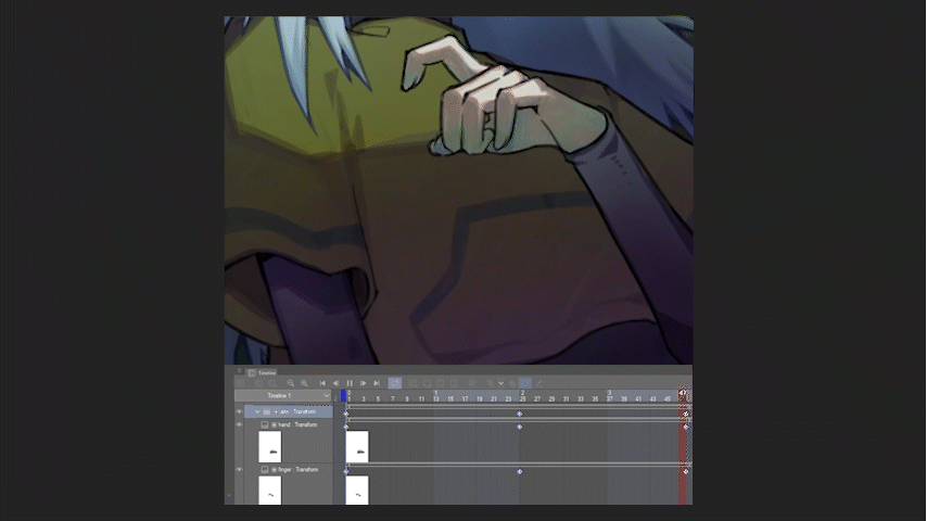 例如,手臂部分——在繪製時,我將它分成線稿、平塗和陰影圖層。這些組件將合併到一個圖層中,用於動畫製作。