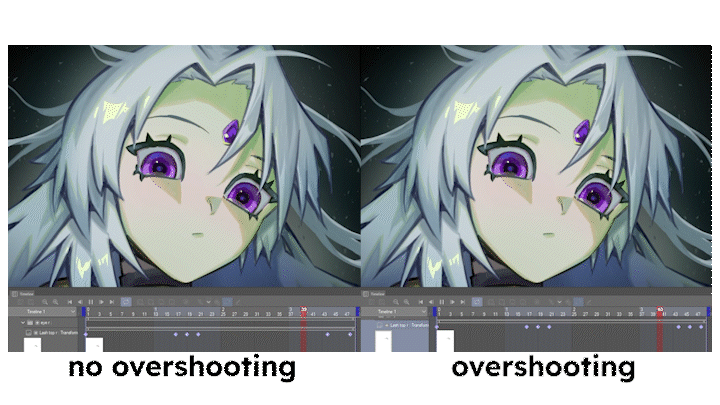 為了讓張大眼睛的動作看起來更自然,我使用了一種動畫技術叫做過度伸展。在這種情況下,我只是讓眼睛在放鬆之前稍微張大一點,這有助於誇大動作並使動畫更具爆發力。你可以在這裡看到比較。