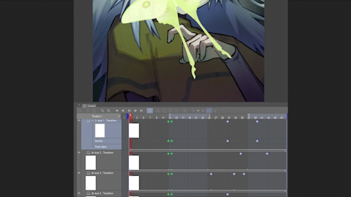 4個髮絲圖層的關鍵影格。我給它們都設定了不同的時間,並透過添加更多關鍵影格,使最底部的髮絲移動速度更快。